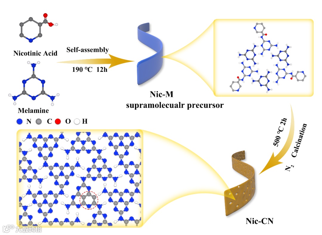 导读:本文利用吡啶结构和氢键调控烟酸和三聚氰胺通过自组装的策略来合成一维带状的超分子前驱体。随后通过带状超分子前驱体得到具有较大的π-电子共轭体系的一维带状碳掺杂氮化碳,实现对氮化碳的电子结构和形貌的同步调