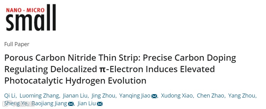 近日,来自黑龙江大学的蒋保江研究员和焦艳清副教授与中国科学院大连化学物理研究所的刘健研究员合作,在国际知名期刊Small上发表题为“Porous Carbon Nitride Thin Strip: Precise Carbon Doping Regulating Delocalized π‐Electron Induces Elevated Photocatalytic Hydrogen Evolution”的研究论文。