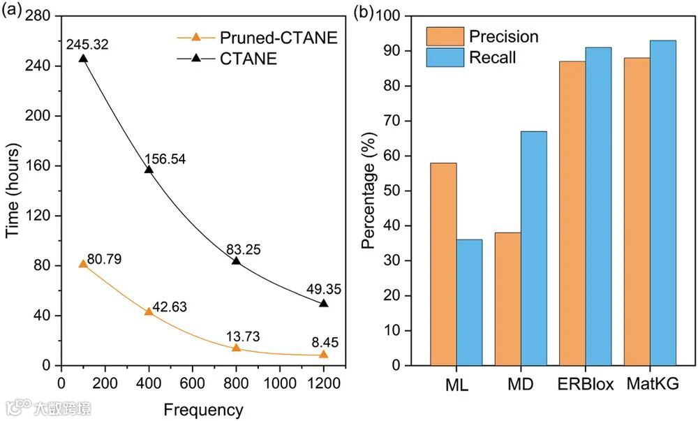 图3. MatKG在搜索速度和信息检索质量方面的评估。(a)剪枝后的CTANE算法与原CTANE算法在搜索时间上的比较;(b)使用Cora数据集比较机器学习模型、依赖匹配模型、ERBlox以及MatKG的精确度和召回率。