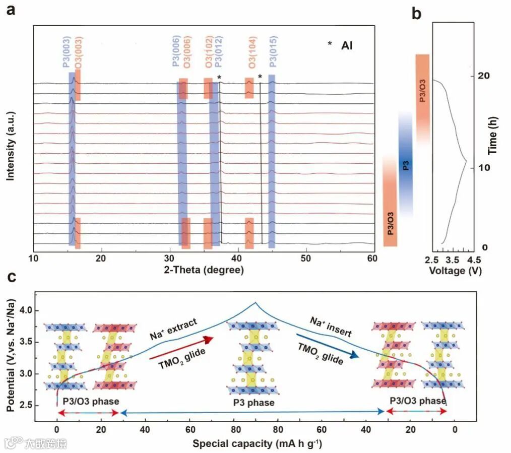 图1. 不同充放电状态下的P3/O3-NNMT结构演变。(a)在2.5~4.15 V 之间0.1C条件下充放电过程的XRD谱图,(b)循环过程中晶体结构演化图,(c)不同充放电状态下对应的晶体结构演变示意图。