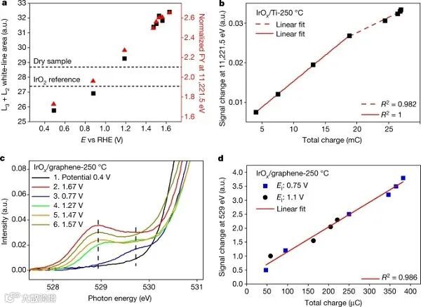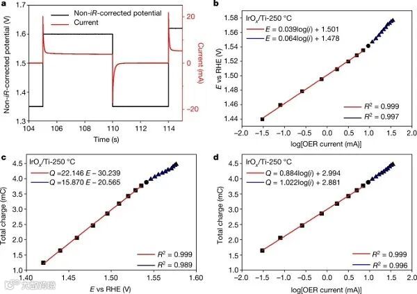 电荷对OER活性的影响。如图1a中,在250℃ (IrOx/Ti-250℃)下煅烧的无定形IrOx电催化剂所示,通过对电流对阴极电压脉冲的响应积分,在给定电位下存储在催化剂中的电荷被量化。通过这种方法可以得到Tafel图(图1b),以及存储电荷与电位或对数(电流)之间的关系,分别如图1c和1d所示。