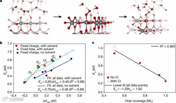 当偏压增加0.5 V时,如果表面氧化态不受限制,则可达到完全氧化的极限。在图4b中用一个虚线箭头表示,包括这额外的氧化电荷产生的总电荷QT的影响。氧化充电减少到ΔHrxn−0.2 eV时;此外,氧化会降低Ea(从0.60 eV降至0.23 eV)。同样,图4b显示,将θh+从3/4 ML减少到1/2 ML,可使Ea增加到0.78 eV,而由总电荷引起的变化,并没有被纯电容充电()所补偿。
