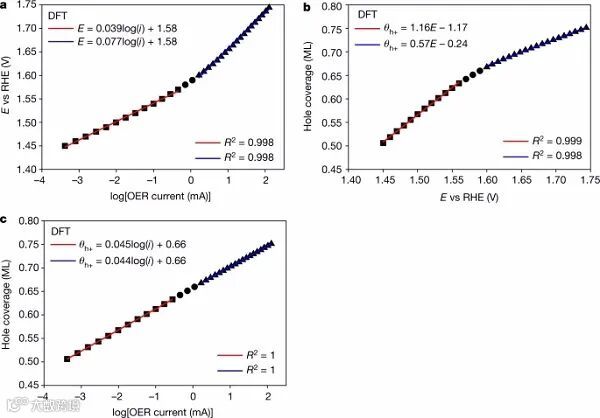 由式(1)计算得到的Tafel曲线和电荷-对数(电流)剖面与实验结果一致(图5)。Tafel斜率为39 mV dec−1,在增加到77 mV dec−1之前可达1.58 V;在相同的电位窗口上,结晶IrO2的塔菲尔斜率分别为43-47 mV dec−1和71-76 mV dec−1。然而,从计算中可以看出,Tafel坡的弯曲现在可以归因于θh+ 对电位的响应的变化(图5b),而不是Tafel分析所建议的机制的质变。计算出的对数(电流)曲线相对于θh+剖面是线性的(图5c),与实验结果一致。