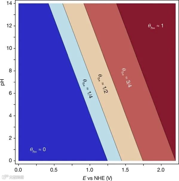 基于Ir材料的OER机制。随着去质子化被确定为主要的电荷存储机制,研究者对OER反应速率的影响进行了密度泛函理论(DFT)计算。首先利用从头算分子动力学(MD)在Perdew Burke Ernzerhof水平上利用水分子平衡IrO2(110)表面,同时改变循环速率θh+,并使用MD快照生成了θh+与电势的相图(图3)。