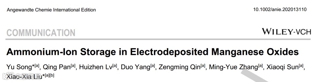 近日,东北大学的宋禹副教授、刘晓霞教授等人在国际知名期刊Angew Chem上发表题为“Ammonium-Ion Storage in Electrodeposited Manganese Oxides”的研究论文。