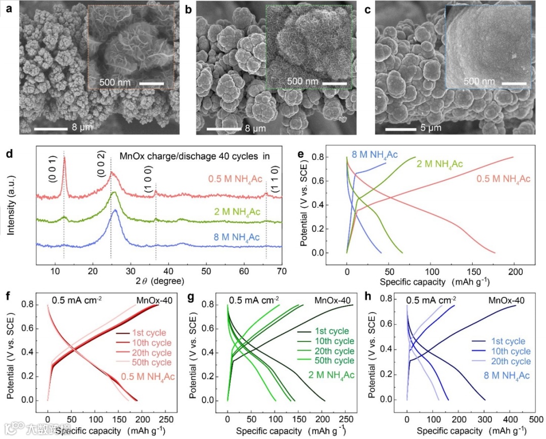 研究了MnOx电极在不同浓度NH4Ac电解液(0.5 M、2 M和8 M)中的相变和电化学性能(图4)。经过40次充放电后,在0.5 M、2 M和8 M NH4Ac电解液中的MnOx电极表现出不同的形貌,NH4Ac浓度的增加抑制了MnOx材料的一维生长。