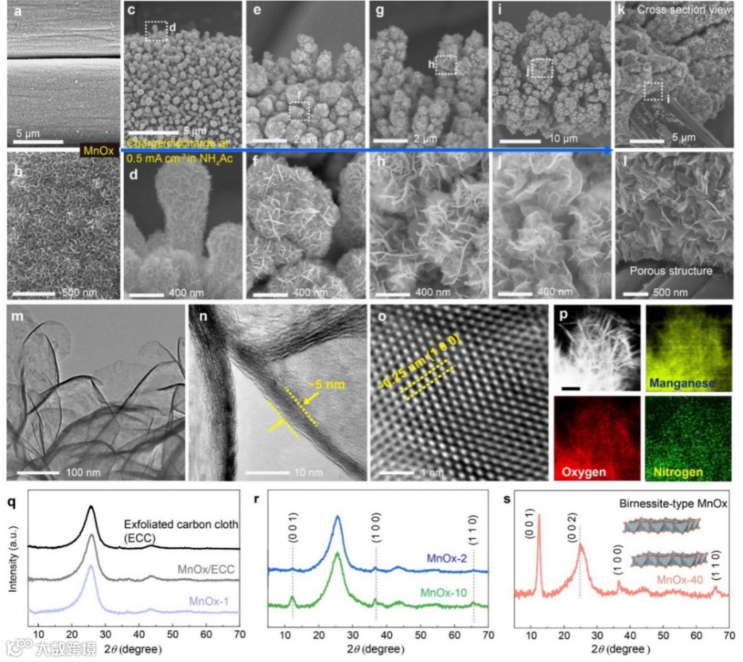氧化锰纳米片尺寸逐渐变大,且呈现一维生长趋势,最后形成一种疏松多孔的氧化锰纳米“森林”形貌。其晶体结构由无定型态转变为层状水钠锰矿。这种转变归因于奥斯瓦尔德熟化及可逆的氧化锰沉积/溶解过程。