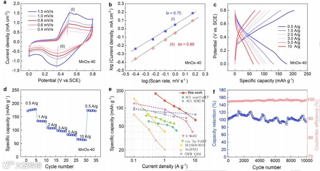 图3.氧化锰在0.5 M醋酸铵电解液中的电化学性能