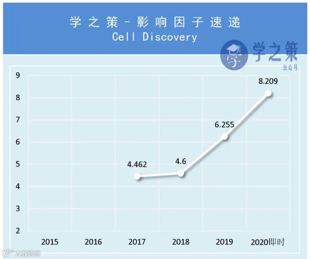 Cell Discovery于2018年获得首个IF达到了4.462,次年变化不大,仅4.6,但2019IF一下子涨到了6.255。而今年的IF上涨更为迅猛,据今天刚刚计算的即时IF表明,Cell Discovery的即时IF已经达到8.209,完成度131.27%。从目前的增速来看,明年的正式IF破9没有问题,甚至有冲击10的潜力!