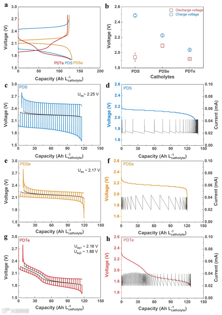 恒电流测试结果表明联苯二碲相比于二硫酚和二硒酚,有着最低的平衡电势和最小的迟滞电压。在0.1mA cm-2的电流密度下,联苯二碲的迟滞电压几乎是二硫酚的1/5。GITT测试结果表明联苯二碲有着最低的平衡电势(平均:1.97 V vs. Li/Li+), 其次是二硒酚 (2.17 V)和二硫酚(2.25 V)。