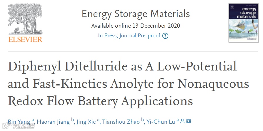 港中文|卢怡君教授 EnSM:联苯二碲作为一种低电势和快速动力学的阳极电解液在非水系液流电池中的应用 科学材料站