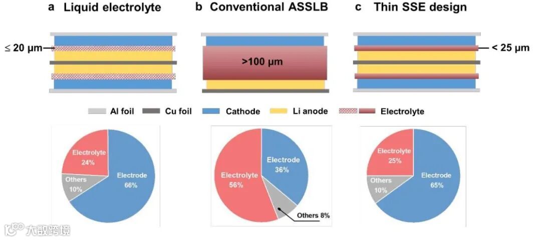 图2. 使用(a)液体电解质、(b)常规SSE和(c)薄SSE的锂电池为基础的电池配置和组件的重量占比图