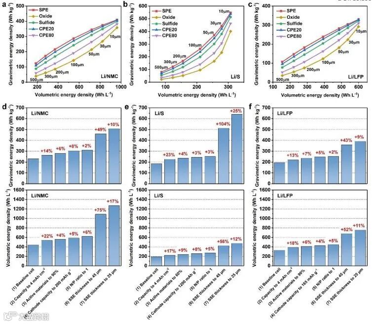图3. 估算(a)Li / NMC811,(b)Li / S和(c)Li / LFP ASSLB的实际重量和体积能密度;(d)Li / NMC811,(e)Li / S和(f)Li / LFP ASSLB的重量和体积能量密度的计算值。
