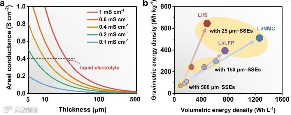 图1. (a)SSE各种离子电导率的面积归一化离子电导率与电解质厚度的关系;