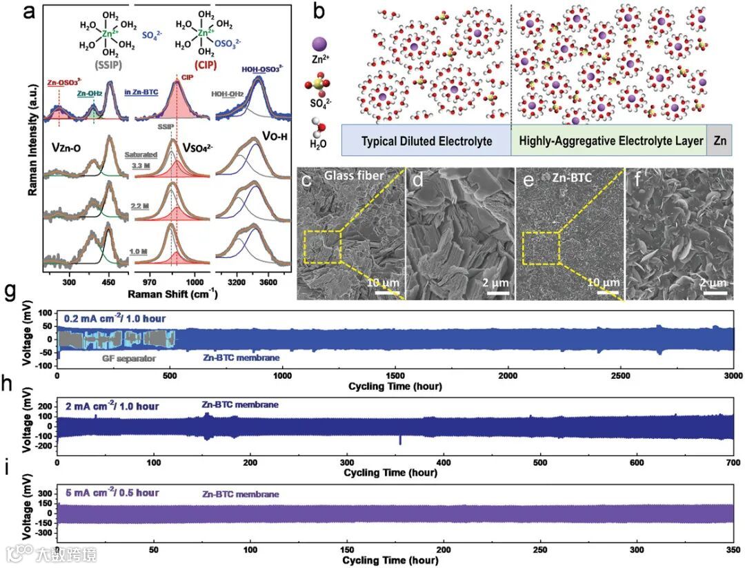 图3 a)不同浓度ZnSO4在Zn-BTC通道中的电解质构型的拉曼光谱。b)典型的稀ZnSO4溶液中锌负极上高聚集电解质层的溶剂化结构。c-f)20个循环后,带有GF和Zn-BTC隔膜的对称Zn电池的Zn负极的SEM图像。g)带有GF和Zn-BTC隔膜的对称Zn电池在0.5 mA cm-2的电流密度下可保持1 h 的长期稳定性。h,i)具有Zn-BTC隔膜的对称Zn电池,电流密度为2 mA cm-2持续1 h和5 mA cm-2保持0.5 h。
