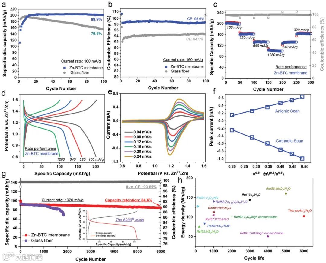 图4 Zn-I2电池的电化学性能。a)带有GF和Zn-BTC隔膜的Zn-I2电池在160mA g-1循环性能。b)Zn-I2电池在160mA g-1的库仑效率。c)带有Zn-BTC膜的Zn-I2电池的倍率性能。d)在不同电流密度下的充放电曲线。e)不同扫描速率的CV曲线。f)还原峰和氧化峰值电流与扫描速率的平方根的线性拟合。g)GF和Zn-BTC膜的Zn-I2电池在电流密度为1920 mA g-1的长循环和用Zn-BTC膜第6000个循环的充放电曲线。h)代表性正极材料及相应电解质系统的可再充电锌电池的对比。
