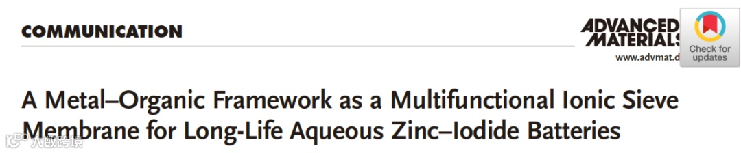 近日,南京大学周豪慎教授联合日本筑波大学Yu Qiao在Advanced Materials上发表题为“A Metal-Organic Framework as a Multifunctional Ionic Sieve Membrane for Long‐Life Aqueous Zinc-Iodide Batteries”的文章。引入三碘化物/碘化物(I3-/I-)氧化还原对的水系可充电锌电池是一种具有安全和成本效益的能源存储形式。然而,由于三碘化物的失控和锌负极上不利的副反应,目前锌碘(Zn-I2)电池的寿命有限。在此,研究者采用空间分辨的拉曼光谱和显微红外光谱表明,锌负极会遭受水和碘物种的腐蚀。随后,他们将金属有机框架(MOF)用作离子筛膜,其可抑制I3-的穿梭和锌负极的副反应。此外,通过调节电解质的溶剂化结构,MOF通道可构建独特的电解质结构。据此,所制备的Zn-I2电池可实现超长寿命(> 6000次),高容量保持率(84.6%)和高可逆性(99.65%)。该工作不仅系统地揭示了游离水和碘物种对Zn负极的影响,而且为开发长寿命水系Zn-I2电池提供了有效策略。