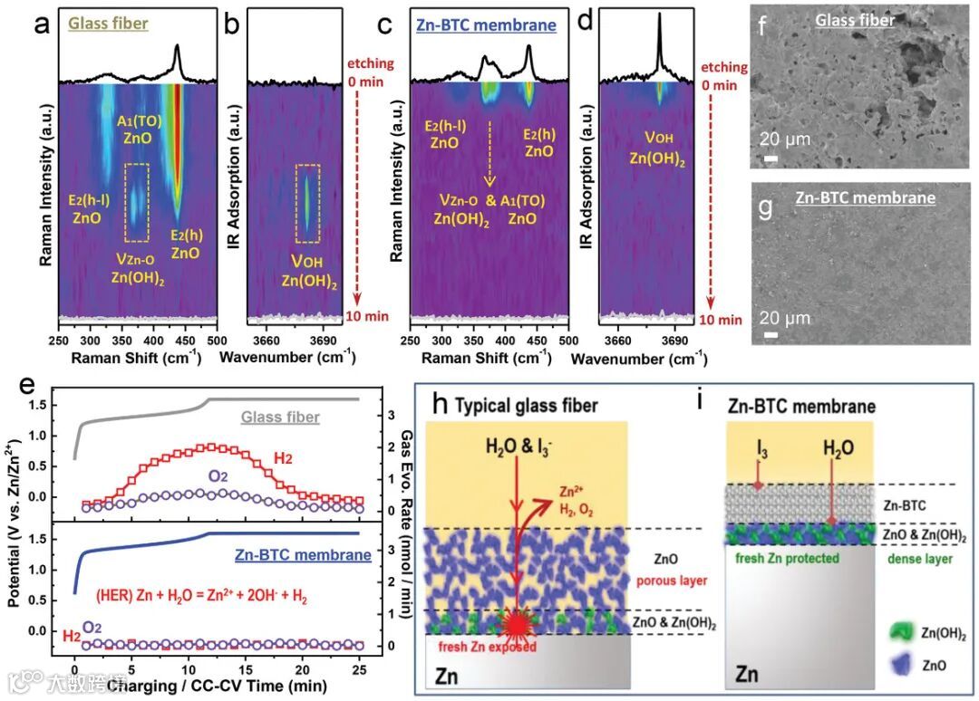 图2 Zn-I2电池用不同隔膜循环后获得的锌负极的特性。a,c)使用GF和Zn-BTC隔膜的拉曼光谱。b,d)带有GF和Zn-BTC隔膜的Micro-IR光谱。e)用GF和Zn-BTC隔膜充电时,H2和O2的释放速率。f,g)用GF和Zn-BTC隔膜循环后的Zn负极的SEM图像。h,i)用GF和Zn-BTC隔膜腐蚀碘和水后,锌负极的成分演变示意图。