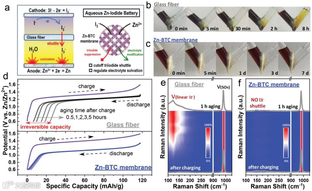 图1 三碘化物梭的表征。a)带有玻璃纤维(GF)隔膜和Zn-BTC膜的Zn-I2电池的示意图。b,c)带有GF隔膜和Zn-BTC膜的V型玻璃透过性实验。d)带有GF和Zn-BTC隔膜的Zn-I2电池的电化学老化测试。e,f)GF和Zn-BTC隔膜老化1 h后的拉曼光谱。
