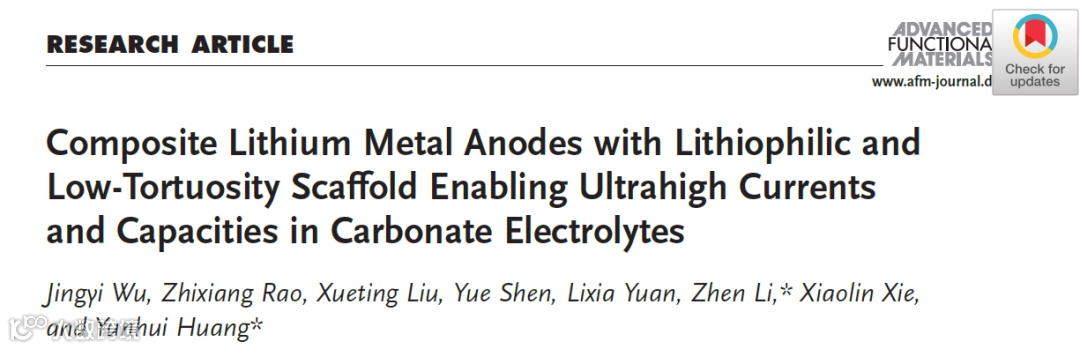 近日,来自华中科技大学的黄云辉和李真教授团队,在国际知名期刊Advanced Functional Materials上发表题为“Composite lithium metal anodes with lithiophilic and low-tortuosity scaffold enabling ultrahigh currents and capacities in carbonate electrolytes”的研究论文。