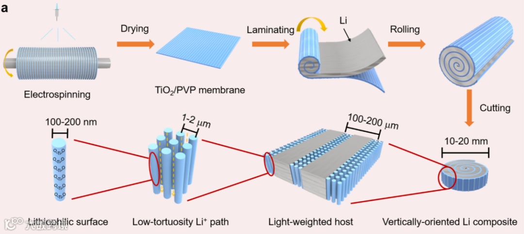 垂直排列的TiO2-PVP阵列卷绕锂箔形成具有交替Li和TiO2-PVP的分级结构。