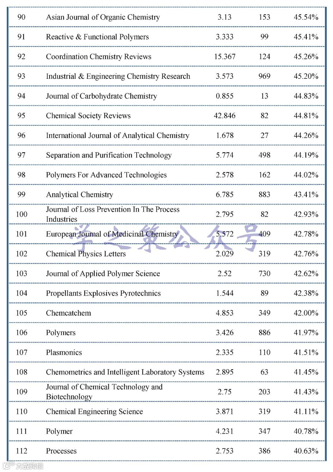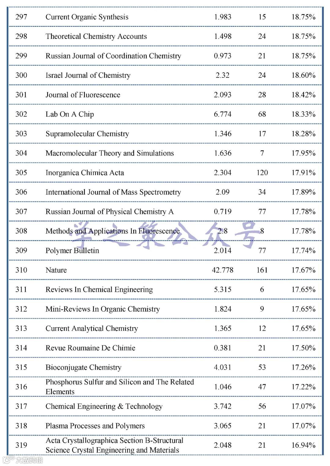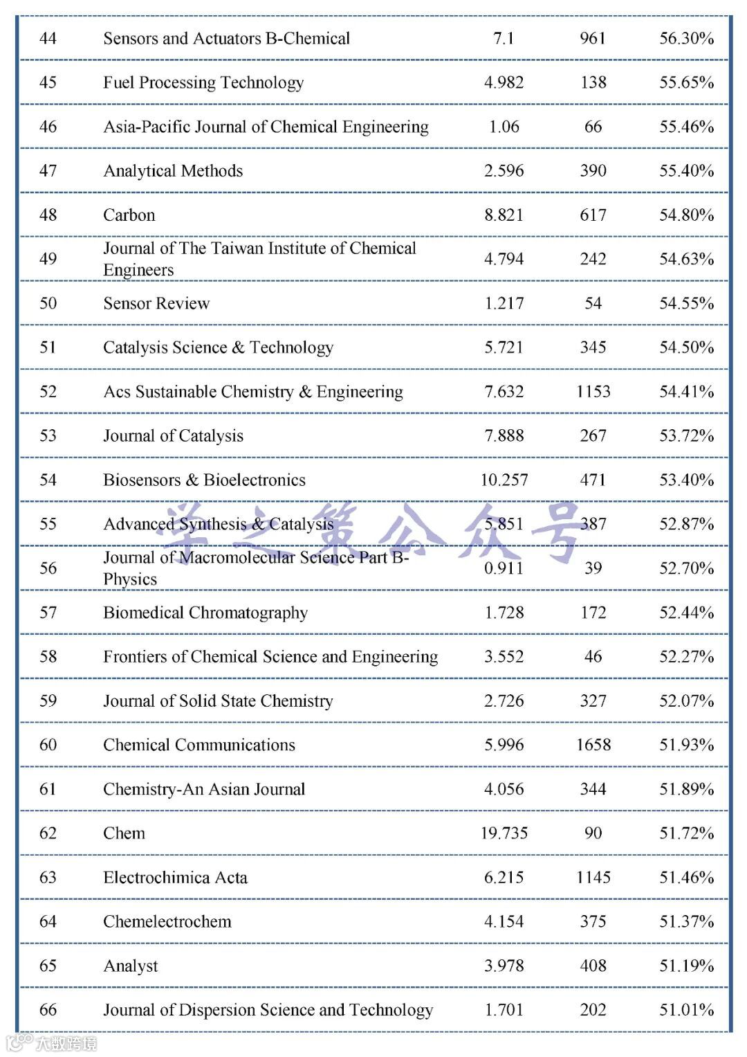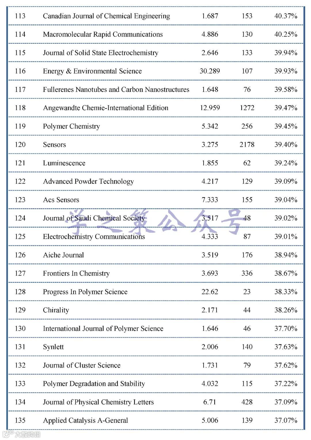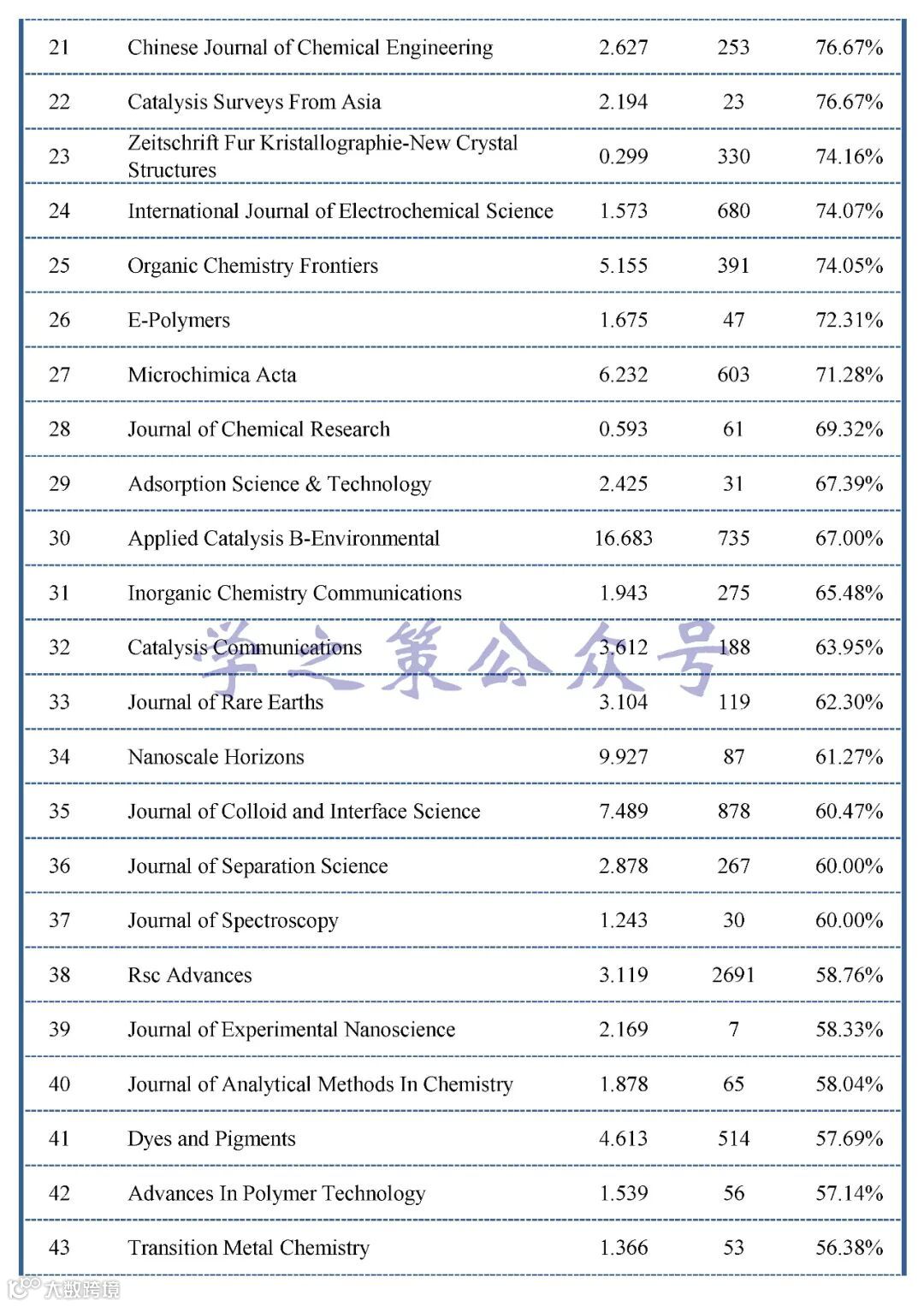 一些国人比较关注的期刊,Applied Catalysis B-Environmental为67%,JCIS为60.47%,Chem为51.72%,CSR为44.81%,EES为39.93%,Angew为39.47%,JACS为29.64%。