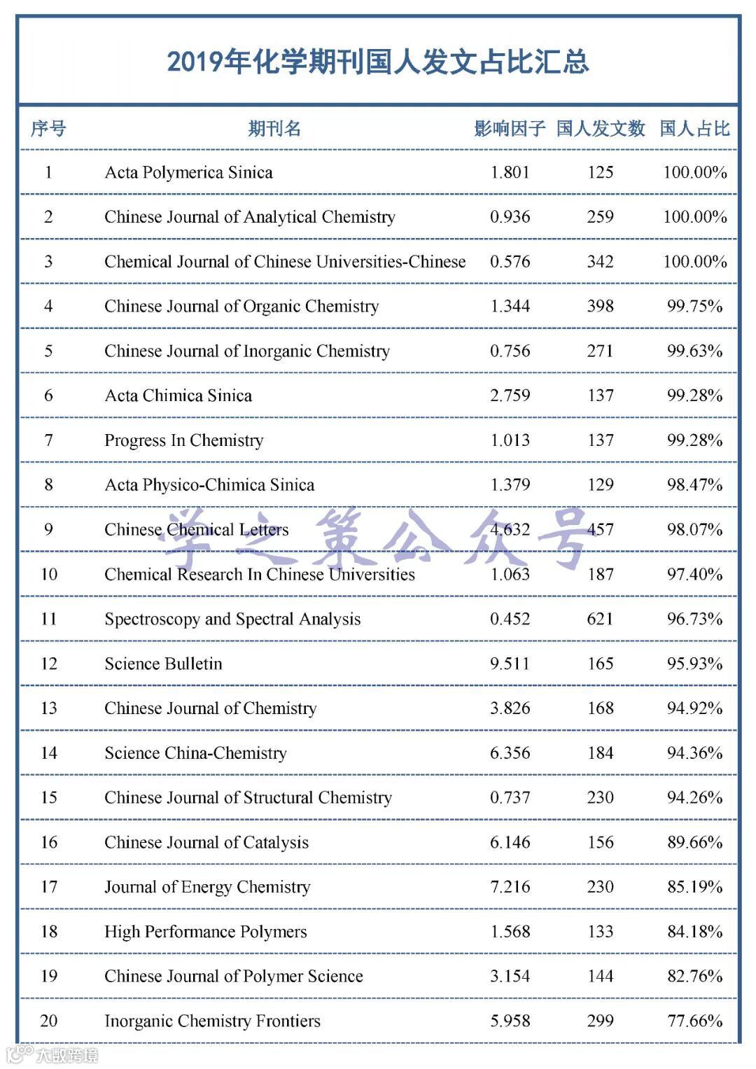 排名前17的期刊都是国产期刊,其中前15国人占比达到了90%以上。Acta Polymerica Sinica(高分子学报)、Chinese Journal of Analytical Chemistry(分析化学)、Chemical Journal of Chinese Universities(高等学校化学学报)、Chinese Journal of Organic Chemistry(无机化学学报)、Acta Chimica Sinica(化学学报)、Progress in Chemistry(化学进展)、Acta Physico-Chimica Sinica(物理化学学报)、Spectroscopy and Spectral Analysis(光谱学与光谱分析)这些都是中文期刊。