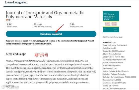 点击任一感兴趣的期刊进入,可以看到期刊更详细的介绍,有利于大家更加了解推荐的期刊,从而决定是否投稿。若确定想要投稿,点击“Submit your manuscript”。