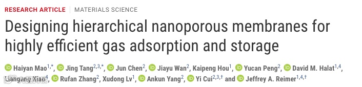 近日,来自斯坦福的崔屹教授与加州大学伯克利分校的Jeffrey A. Reimer教授与合作,在Science子刊Science Advances上发表题为“Designing hierarchical nanoporous membranes for highly efficient gas adsorption and storage”的文章。