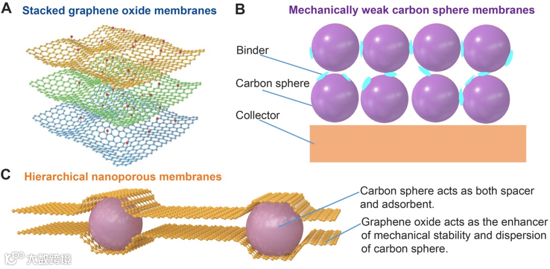导读:本文设计了分层纳米孔膜,一类结合碳球和氧化石墨烯的纳米复合材料。分级碳微球,使用化学活化结合微波加热,作为阻止石墨烯层间的间隔剂和吸附剂。分层碳微球阻隔了氧化石墨烯的团聚,而氧化石墨烯薄片则是起到有效