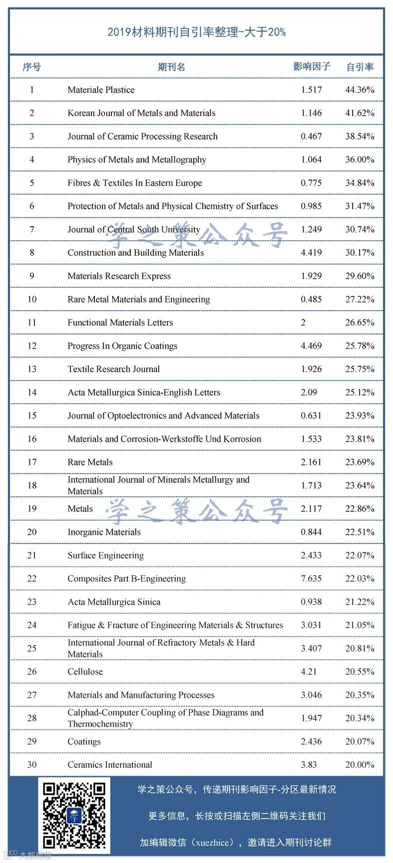 自引率大于20%的材料期刊共有30本,其中最高的是Materiale Plastice,自引率高达44.36%,今年没有被镇压也真是命大福大。另外一本高于40%的是Korean Journal of Metals and Materials,达到了41.62%。