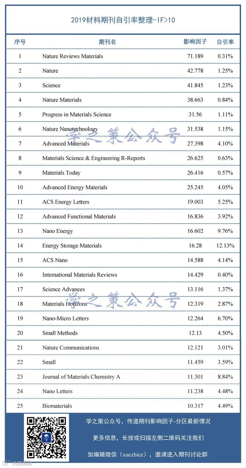 IF大于10的材料期刊共有25本,其中影响因子最高的Nature Reviews Materials在所有材料期刊中自引率最低,真是非常良心。