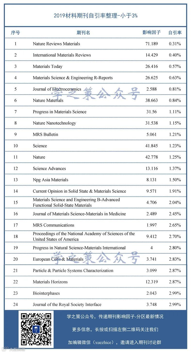 自引率小于3%的材料期刊共有24本,其中最低的为Nature Reviews Materials,自引率仅0.31%。排名第二的International Materials Reviews也仅0.40%。这两本都是综述,自引率低也是比较合理的。
