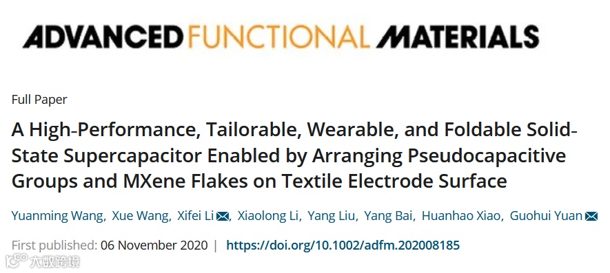近日,哈尔滨工业大学Li Xifei与袁国辉教授等合作。在国际期刊 Advanced Functional Materials 上发表题为“A High‐Performance, Tailorable, Wearable, and Foldable Solid‐State Supercapacitor Enabled by Arranging Pseudocapacitive Groups and MXene Flakes on Textile Electrode Surface”的研究工作。