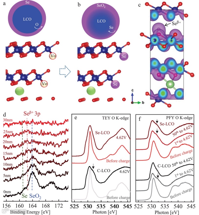 研究发现,钴酸锂充电到高电压时虽然可以将能量密度提高40%以上,但氧离子的逃逸会在结构中留下大量氧空位,从而导致充电态CoO2发生相变,从层状转变成尖晶石结构,从而阻碍锂离子扩散通道。当材料表面存在硒层时,一方面以二维结构排布的Se可以捕捉材料表面逃逸的氧离子,阻碍其进入电解液。更重要的是,表面的硒原子会进入氧离子空位从而取代氧离子的位置。