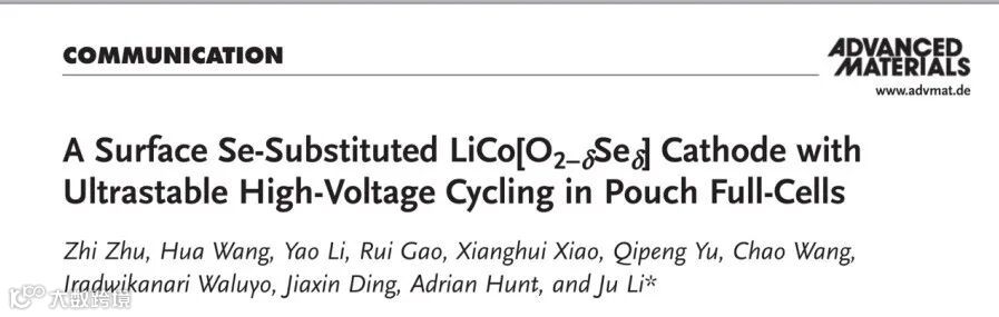 近日,来自美国麻省理工学院的李巨教授研究组在国际顶级期刊Advanced Materials(影响因子:27.4)上发表题为“A Surface Se‐Substituted LiCo[O2−δSeδ] Cathode with Ultrastable High‐Voltage Cycling in Pouch Full‐Cells”的文章。