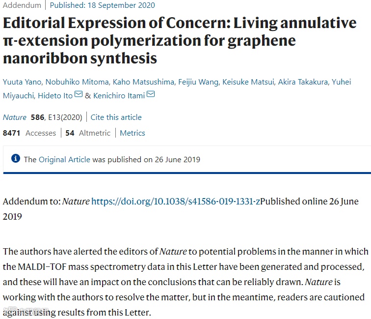 该研究小组在继续探索石墨烯纳米带(GNR)的合成中无法复制论文中提出的一些结果。仔细检查源数据已发现该论文中MALDI-TOF质谱数据的原始生成和处理方式存在潜在问题。具体而言,基于GNR中所有碳原子均为12C(单同位素)的假设而计算得出GNRs 2,7和8的确切分子量是错误的。在所有GNR中,准确的质量峰应高出约6至9个质量单位。因此,观察到的质谱图与建议的GNR结构不匹配。一些GNR的同位素模式(例如,GNR 8的扩展数据图7c,d )与(正确的)计算光谱不匹配。这些也不支持文章提出的GNR结构的形成。GNR 28的质谱基线(噪声)看起来是相同的,这使海量数据的完整性受到质疑。原始MALDI-TOF质谱数据无法得到,仅存在可编辑的二次数据,这也引起了有关质量数据完整性的担忧。最后作者深表歉意,并向科学界表示歉意。