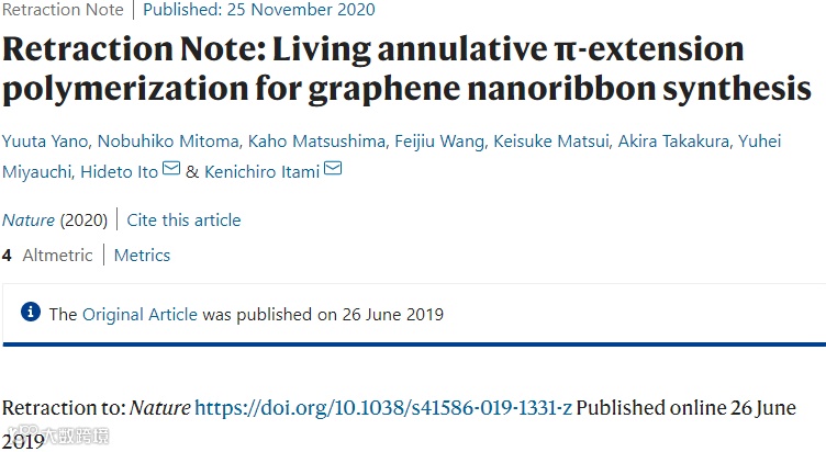 3 Yano, Y., Mitoma, N., Matsushima, K. et al. Retraction Note: Living annulative π-extension polymerization for graphene nanoribbon synthesis. Nature (2020). https://doi.org/10.1038/s41586-020-2950-0