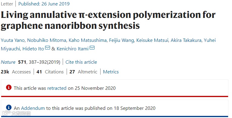 2 Yano, Y., Mitoma, N., Matsushima, K. et al. Editorial Expression of Concern: Living annulative π-extension polymerization for graphene nanoribbon synthesis. Nature 586, E13 (2020). https://doi.org/10.1038/s41586-020-2756-0
