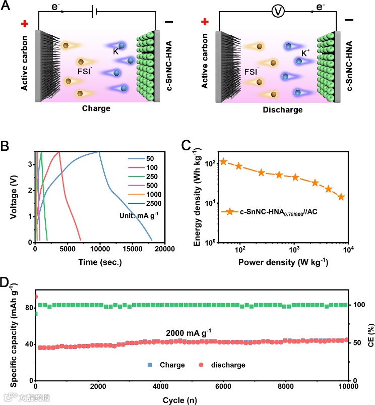 图4. 基于c-SnNC-HNA负极的钾离子混合电容器