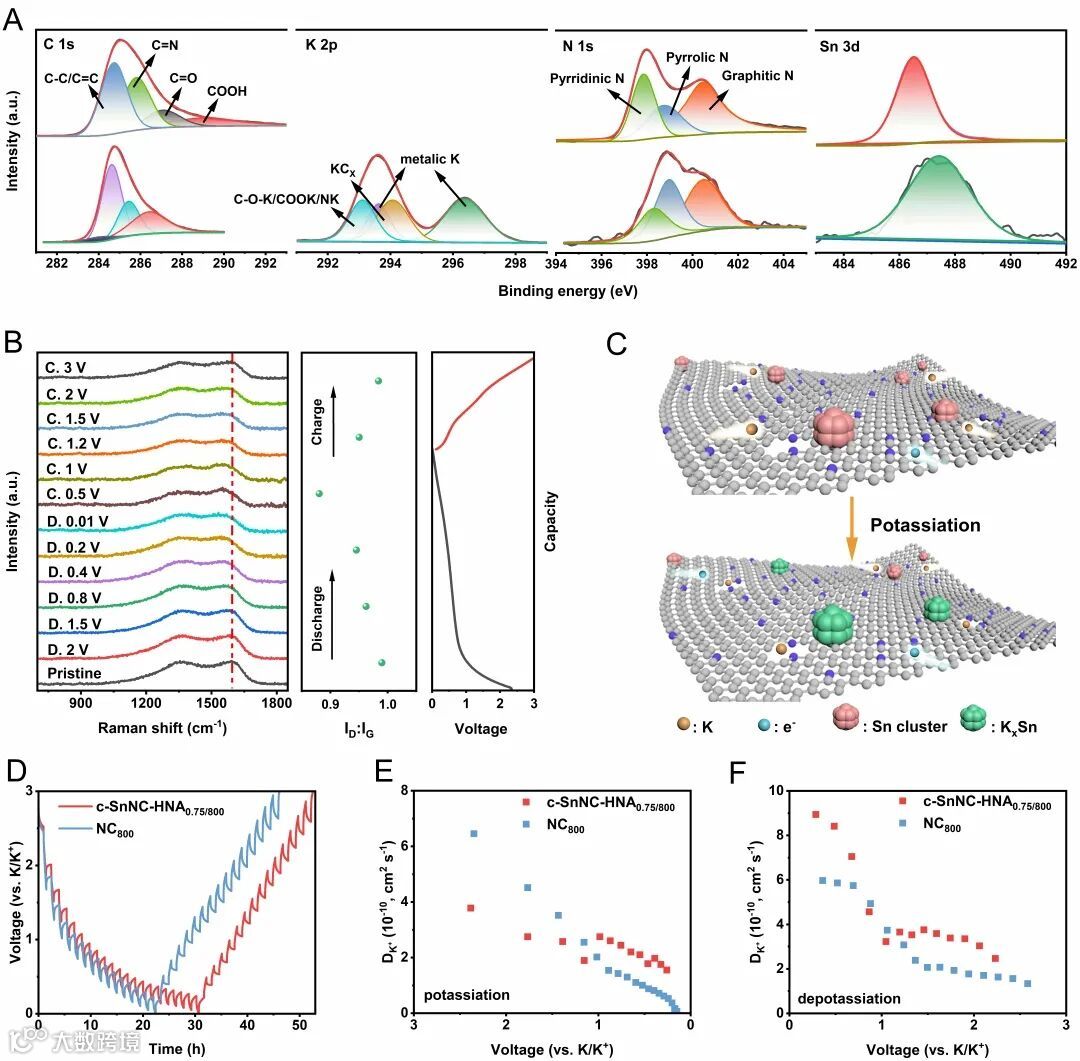 非原位XPS和原位拉曼测试表明,c-SnNC-HNA 中的碳、氮、Sn均可以作为活性位点存储钾离子。得益于此,c-SnNC-HNA的离子扩散系数得到了明显的增加。