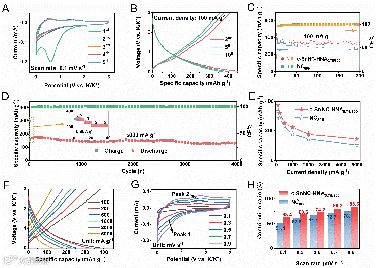 将c-SnNC-HNA负极材料组装成钾、钠、锂离子半电池时,材料表现出优异的循环性能和倍率性能。具体的,在5A g-1的电流密度下钾离子电池可以循环4000圈,容量损失率仅为0.06‰。钠离子电池在5A g-1的电流密度下,循环4000圈后容量保持率接近100%。