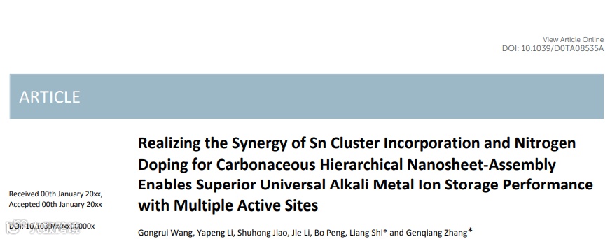 近日,中国科学技术大学的章根强教授课题组在知名期刊Journal of Materials Chemistry A上 以“Realizing the Synergy of Sn Cluster Incorporation and Nitrogen Doping for Carbonaceous Hierarchical Nanosheet-Assembly Enables Superior Universal Alkali Metal Ion Storage Performance with Multiple Active Sites”的文章,该工作对碱金属离子存储材料的发展具有重要的指导意义。