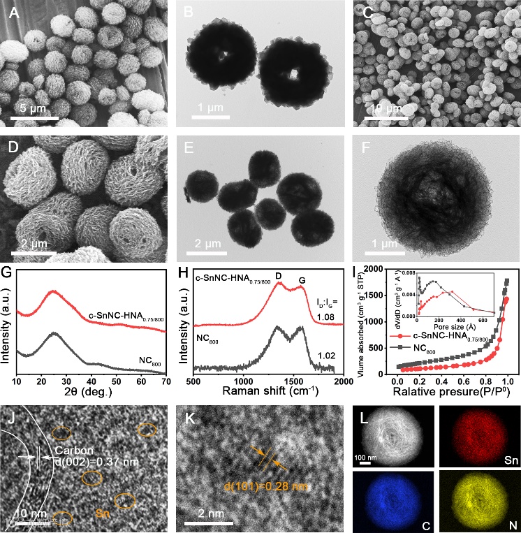 这项工作提出了一种简易可量产的方法制备Sn团簇和氮共同改善的碳材料(c-SnNC-HNA)。结构表征显示,该材料为Sn团簇复合和N掺杂共同作用的球形多孔结构(图1)。