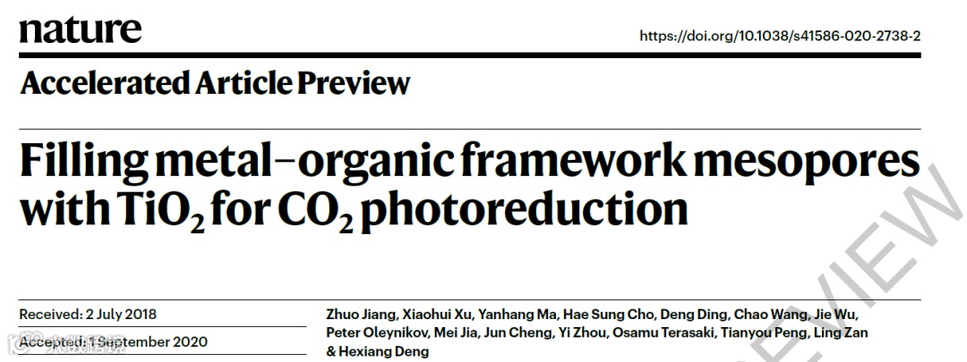 近日,武汉大学邓鹤翔、昝菱教授和上海科技大学的Osamu Terasaki老师合作在国际顶级期刊Nature上发表题为“Filling metal–organic framework mesopores with TiO2 for CO2 photoreduction”的研究工作。