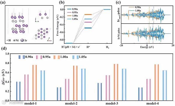 为了了解应变效应对HER活性的内在影响,使用VASP通过广义梯度近似(GGA)方法进行了密度泛函理论计算。根据原子环境的不同,建立了4种H原子的吸附位点,如图4a所示。氢吸附自由能(ΔGH*)可以描述HER活性,|ΔGH*|应接近零以达到最佳HER活性。根据晶面间距分析,为DFT计算建立了具有各种应变晶格参数的IrNi原子模型。如图4b所示,模型1显示了在不同应变效应下减小的ΔGH*,并且10%应变的结构显示出最小的ΔGH*,表明其HER活性最佳。此外,随着应变幅度的减小,模型2、3、4的H*吸附持续减弱,表明与原始IrNi结构相比,应变结构具有增强的电催化活性,如图4d所示。进一步研究了主要源自d状态费米能级附近的表面Ir原子的投影态密度(PDOS),以探测模型1中吸附物与Ir原子之间的电子相互作用(图4c)。压缩应变时的改性电子结构是增强的Ir-Ni键和减弱的含氢中间体键合强度的根源,因此提高了HER活性。