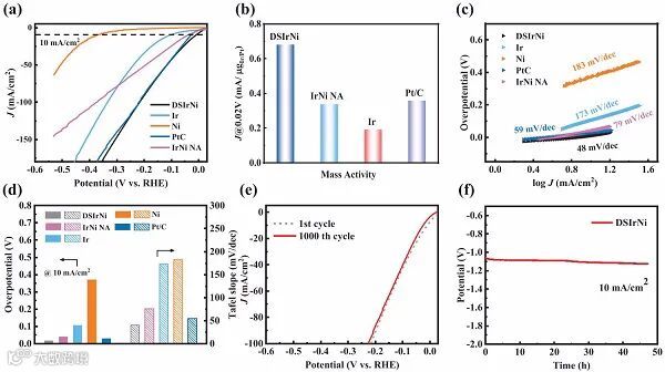 图3. DSIrNi@CNTS的电化学活性评估。(a)HER的线性扫描伏安法(LSV)曲线。(b)催化剂的质量活性。(c)相应的催化剂Tafel斜率。(d)过电位和Tafel斜率的比较。(e)1000次循环后HER的极化曲线。(f)恒定电流密度为10 mA cm-2时的HER计时电位曲线。