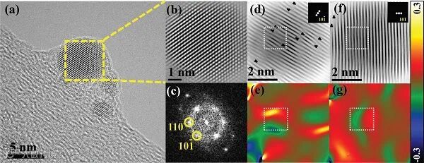 图2. (a)IrNi纳米粒子的HRTEM图像。(b)纳米粒子的IFFT图像。(c)对应的FFT图案。(d,f)相应的IFFT图案,由分别沿着(10-1)和(110)标记有“T”的众多位错组成。(e,g)exx和exy的应变分布。