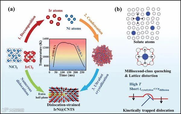 图1. 通过热冲击过程产生位错的示意图。(a)IrCl3和NiCl2分解为Ir和Ni原子,然后在≈150 ms内经历了超快的缩合和结晶化。(b)位错运动在动力学上受到晶格畸变和毫秒级淬火过程的阻碍。