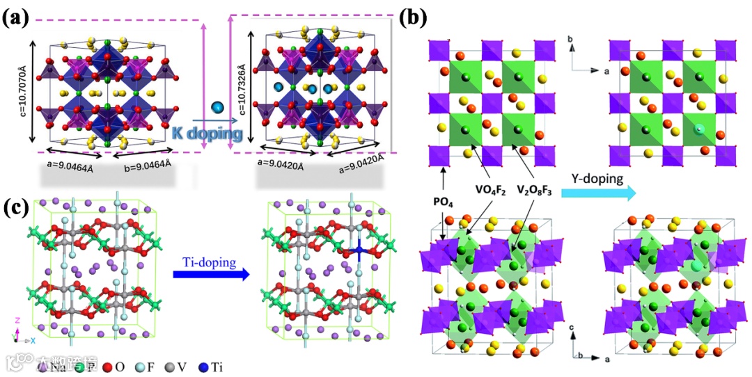 图四:(a) K+,(b) Y3+,(c) Ti2+掺杂的NVPF晶体结构示意图。